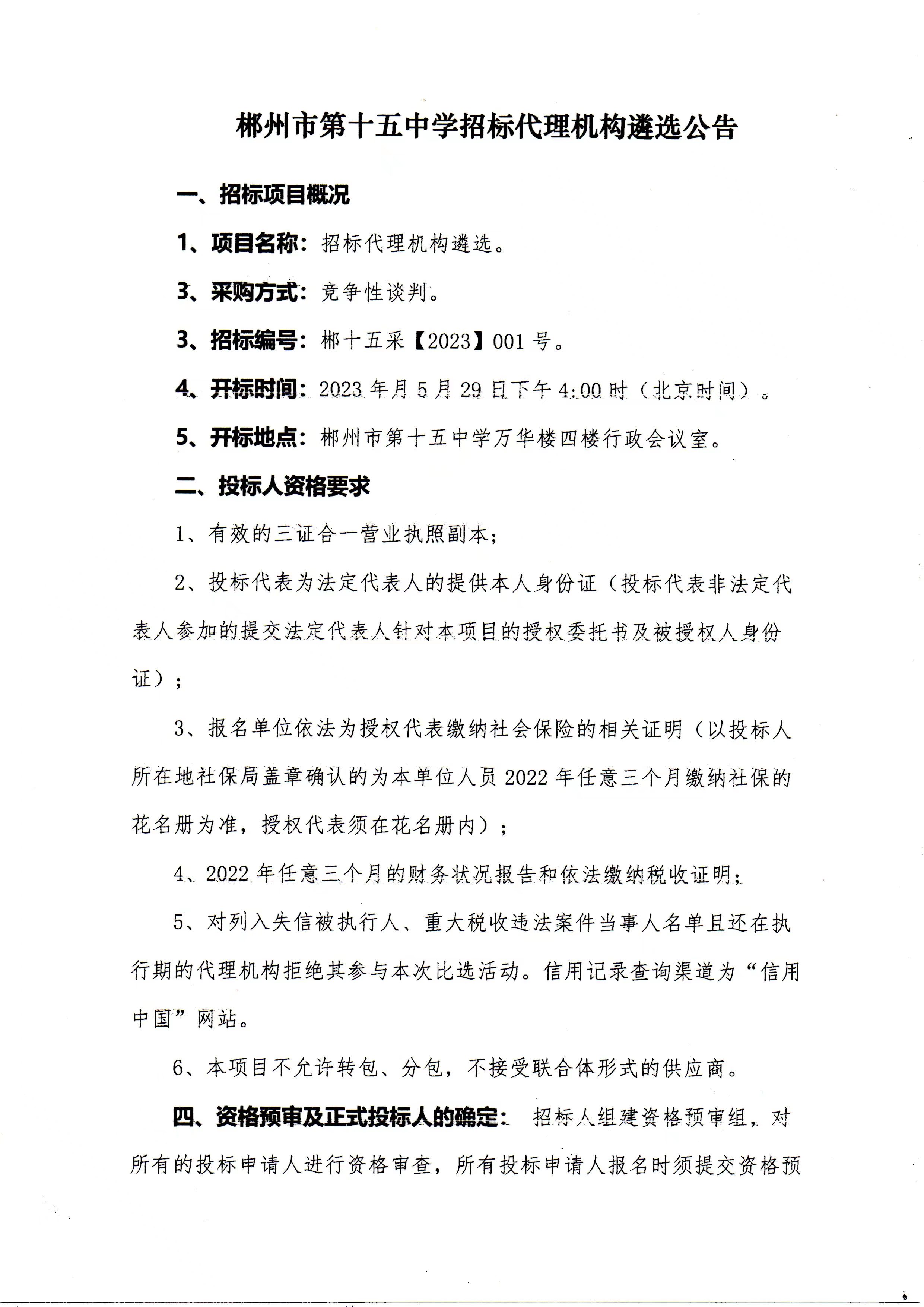 郴州市第十五中学2023年教育附加项目代理单位入围中标候选人排序表